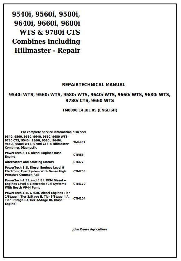 John Deere 9660 9540i 9560i 9580i 9640i 9660i 9680i WTS 9780i CTS Combine Repair Technical Manual TM8090