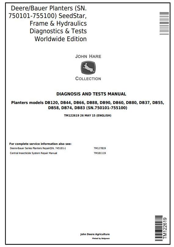 John Deere Bauer DB37 to DB120 SeedStar Frame Hydraulics Planter Diagnostic Test Manual TM122619