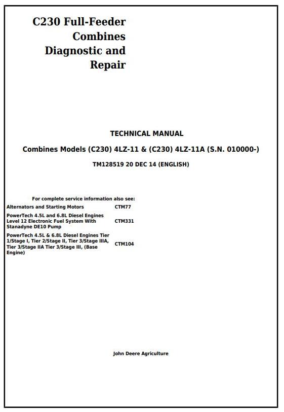 John Deere C230 4LZ-11 4LZ-11A Full-Feeder Combine Diagnostic Repair Technical Manual TM128519