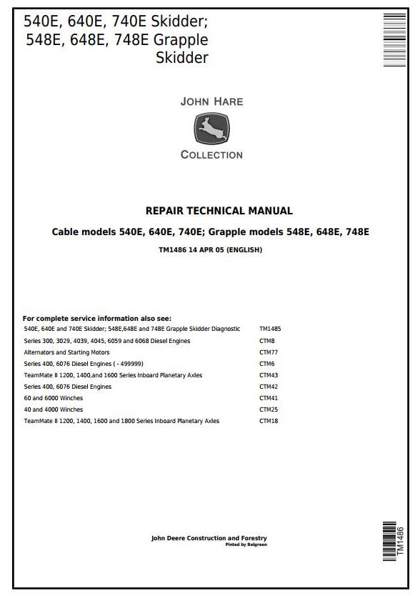 John Deere Cable Grapple Skidder 540E 640E 740E 548E 648E 748E Repair Technical Manual TM1486