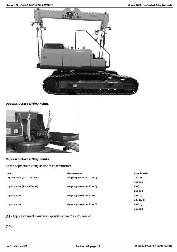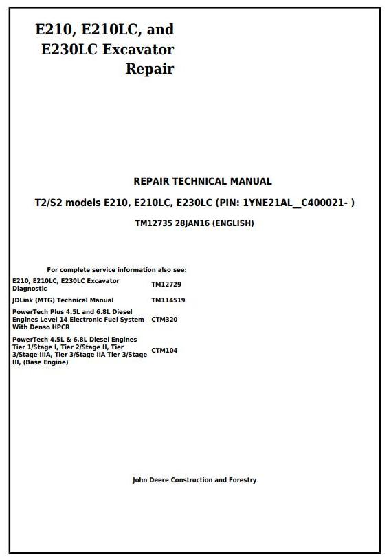 John Deere E210 E210LC E230LC Excavator Repair Technical Manual TM12735