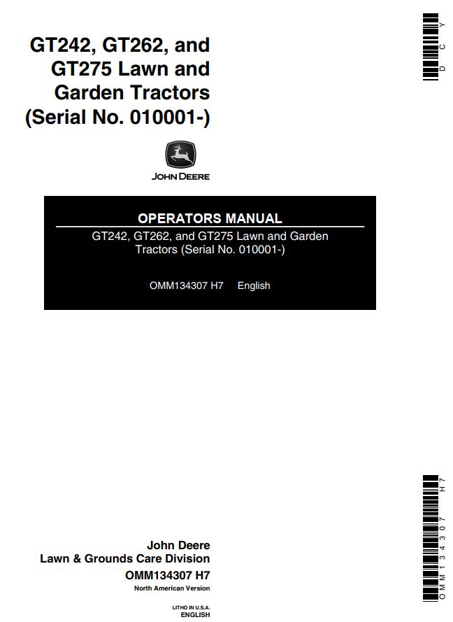 John Deere GT242 GT262 GT275 Operators Manual OMM134307