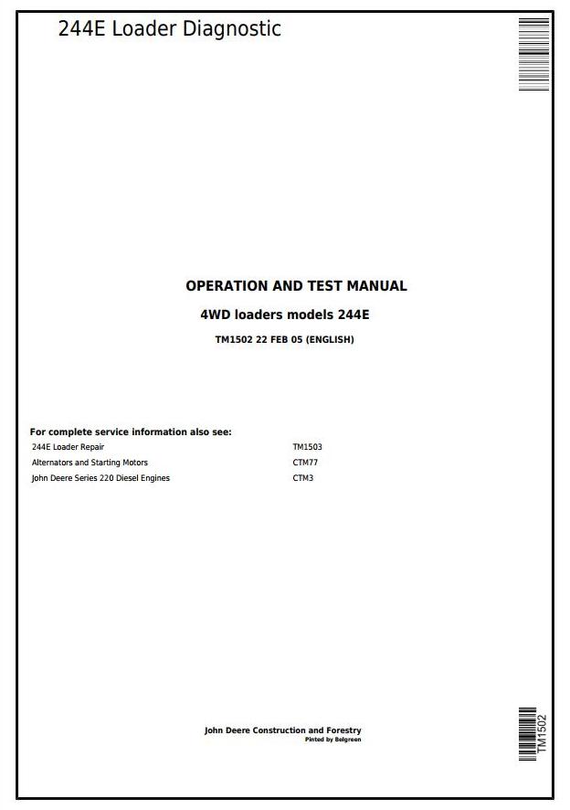 John Deere Loader 244E 4WD Operation Test Manual TM1502