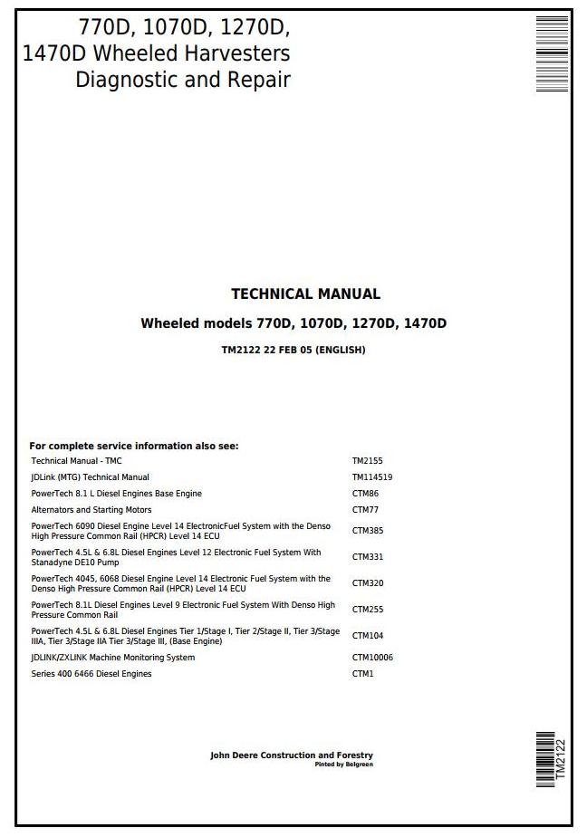 John Deere Timberjack 770D 1070D 1270D 1470D Wheeled Harvester Diagnostic Repair Technical Manual TM2122