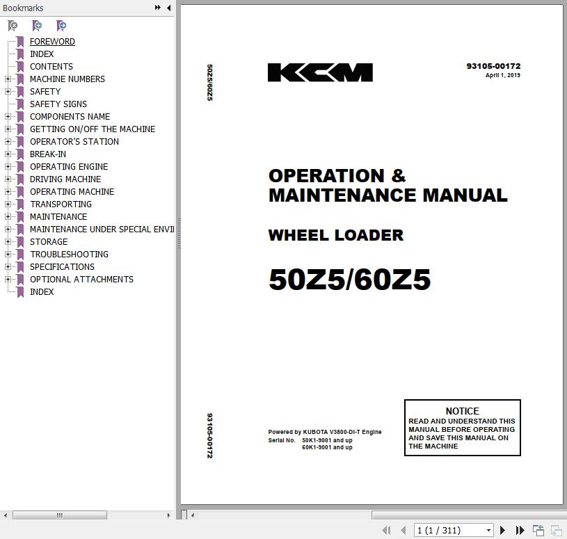 The Bookmarks of Kawasaki 50Z5 60Z5 Wheel Loader Operation & Maintenance Manual: