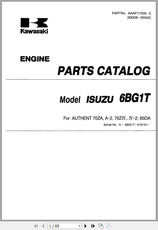 Kawasaki 70ZA 70ZA-2 70ZIV 70ZIV-2 65DA ISUZU 6BG1T Engine Parts Catalog AAAP17305-2 (93308-00042) EN JP 65 Pages