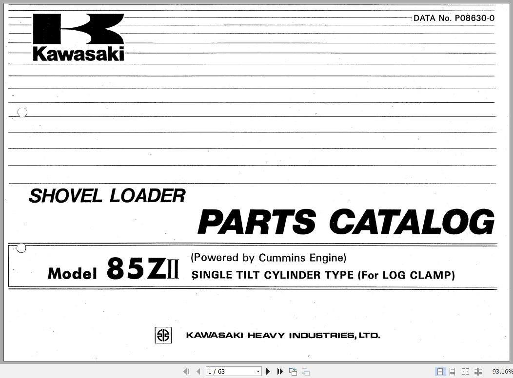 Kawasaki 85ZII Shovel Loader Single Tilt Cylinder Type For Log Clamp Parts Catalog P08630-0 EN JP 63 Pages 1985
