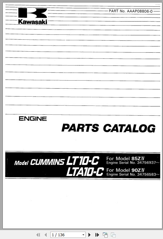 Kawasaki 85ZIV 90ZIV CUMMINS LT10-C LTA10-C Engine Parts Catalog AAAP08806-0 EN JP 136 Pages