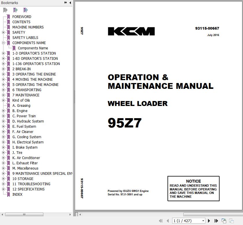 Kawasaki 95Z7 Operation & Maintenance Manual 93115-00667 (US) 427 Pages 2016