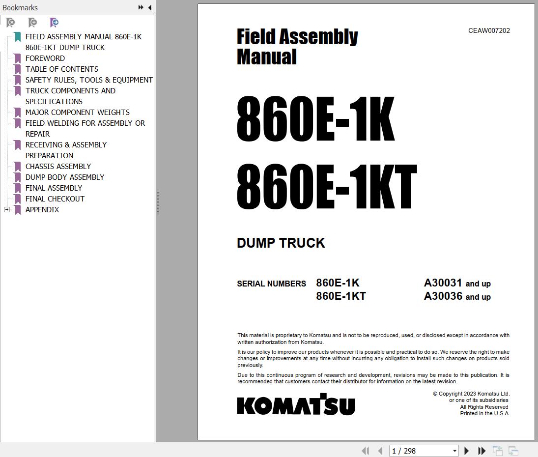 The Bookmarks of Komatsu 860E-1K 860E-1KT Dump Truck Field Assembly Manual: