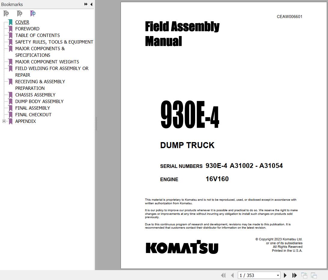 The Bookmarks of Komatsu 930E-4 Dump Truck Field Assembly Manual: