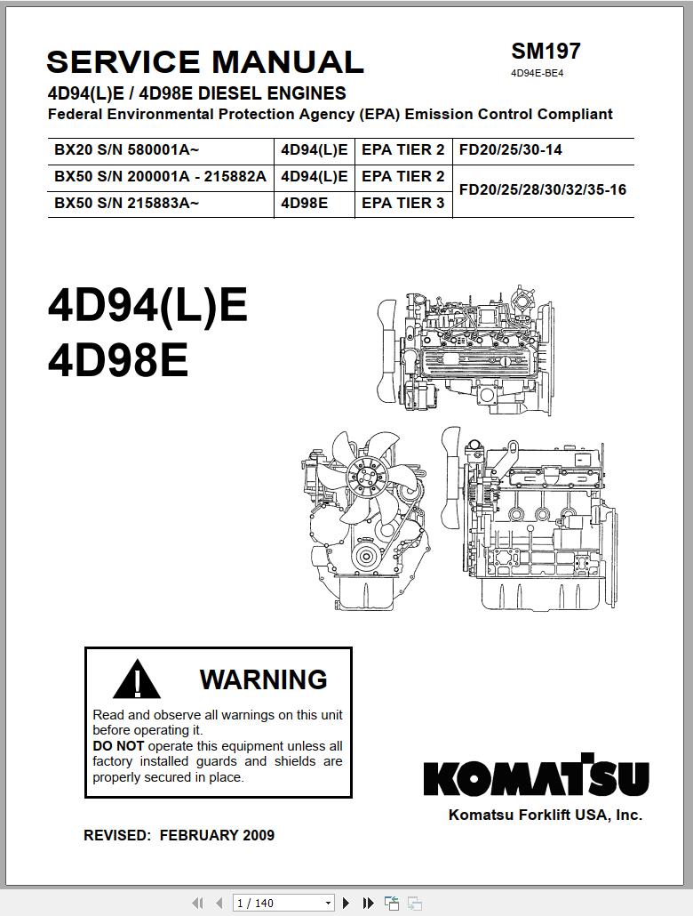 Komatsu BX20 BX50 Series 4D94E 4D94LE 4D98E Diesel Engine Service Manual SM197