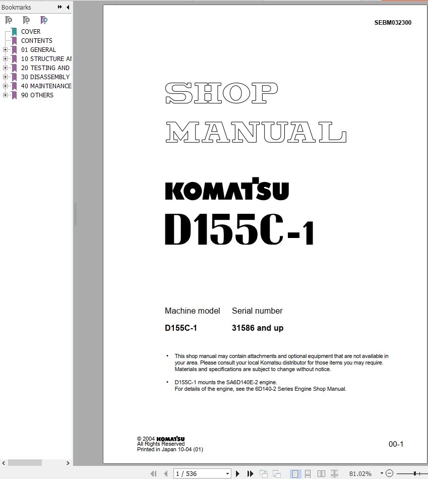 The Bookmarks of Komatsu D155C-1 PipeLayer Shop Manual: