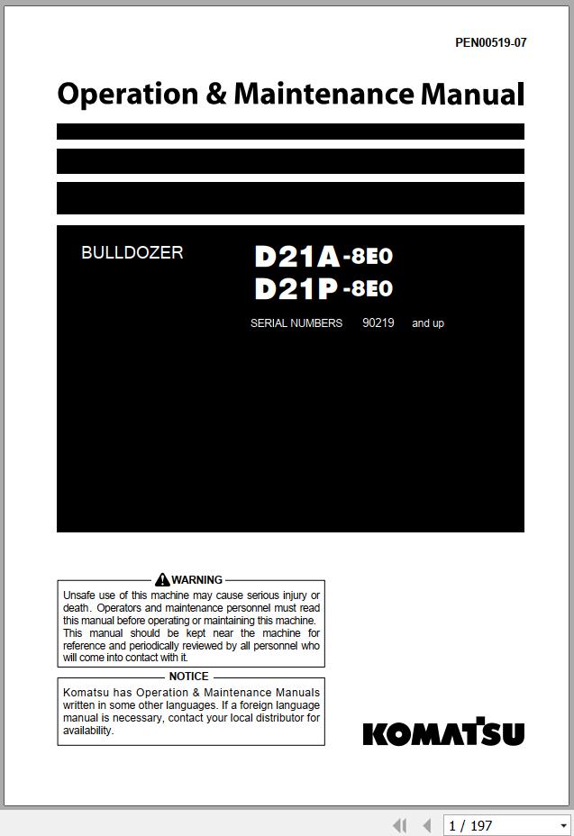 Komatsu D21A-8E0 D21P-8E0 Operation & Maintenance Manual PEN00519-07