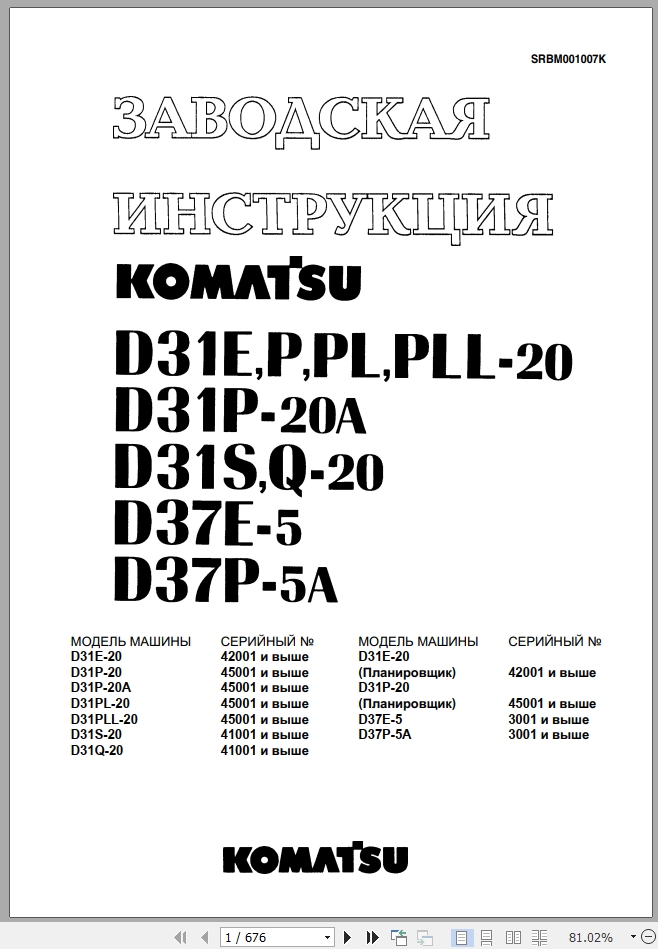 Komatsu D31E P PL PLL-20 D31P-20A D31S Q-20 D37E-5 D37P-5A Shop Manual SRBM001007K RU