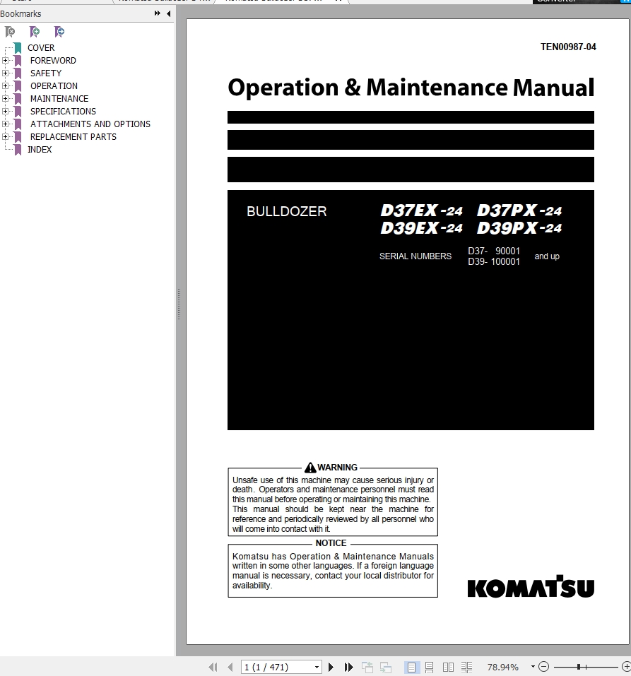 Komatsu D37EX-24 D37PX-24 D39EX-24 D39PX-24 Operation & Maintenance Manual TEN00987-04