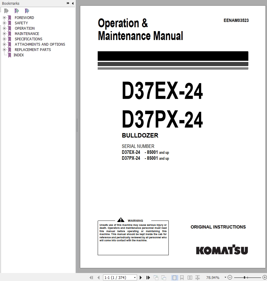 Komatsu D37EX-24 D37PX-24 Operation & Maintenance Manual EENAM03523