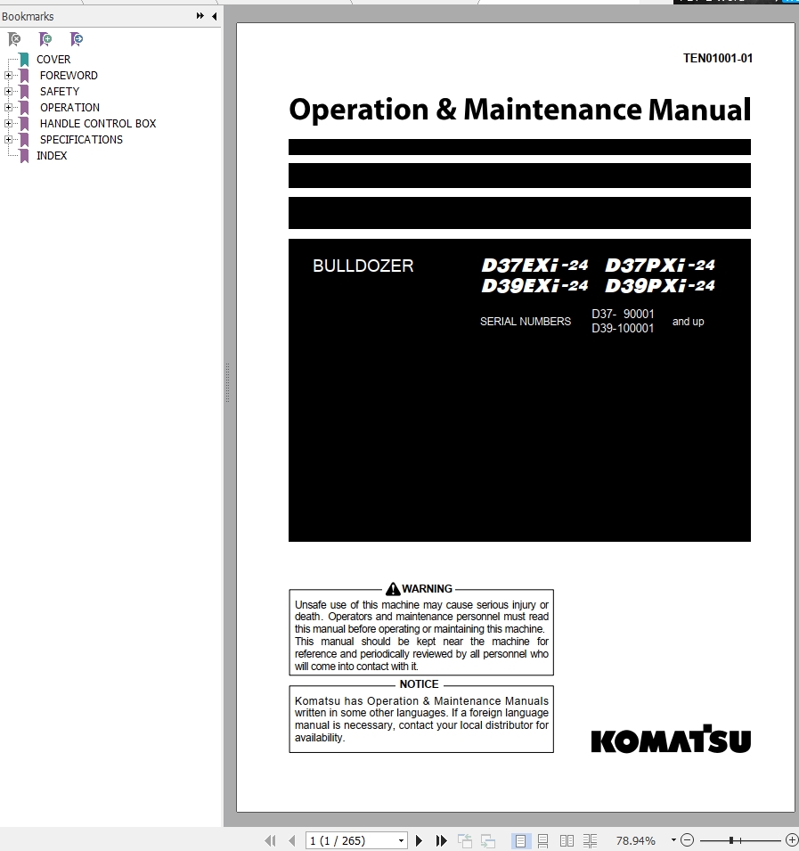 Komatsu D37EXi-24 D37PXi-24 D39EXi-24 D39PXi-24 Operation & Maintenance Manual TEN01001-01