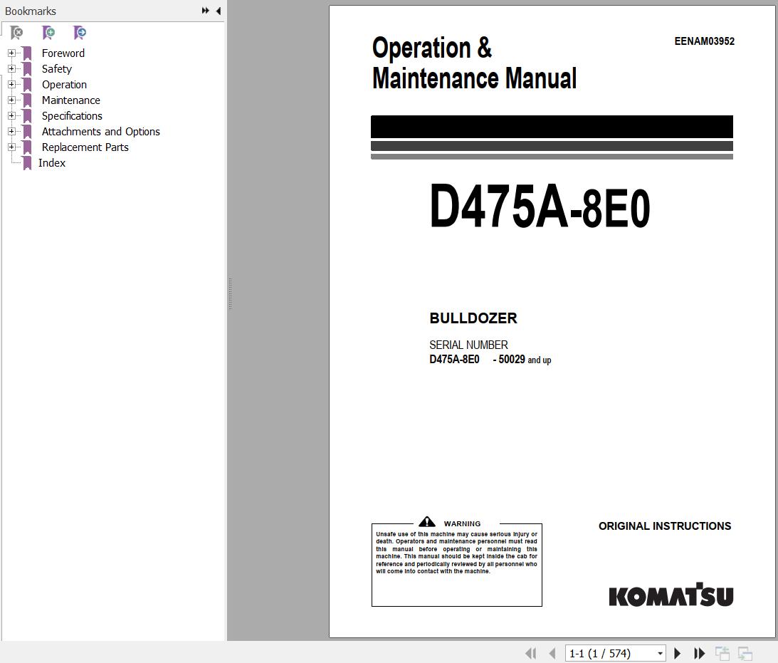 The Bookmarks of Komatsu D475A-8E0 Bulldozer Operation & Maintenance Manual: