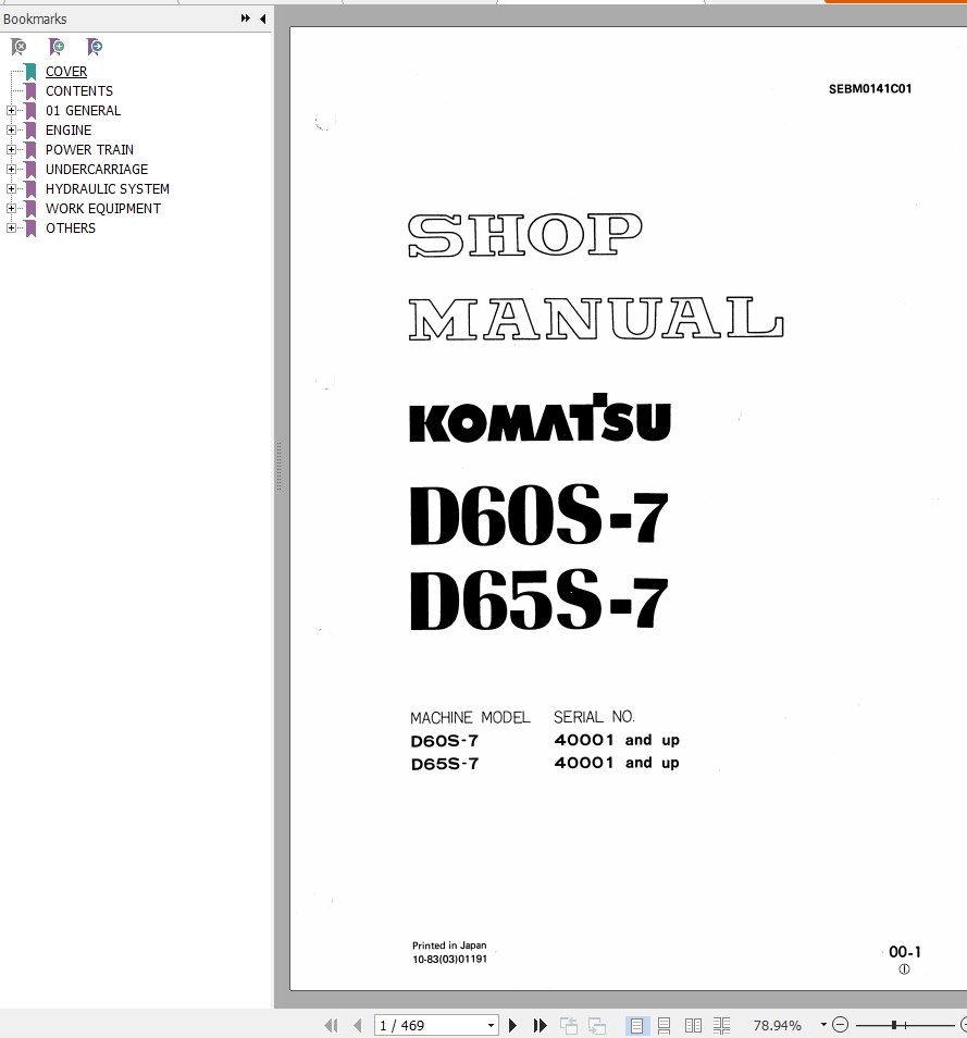 Komatsu D60S-7 D65S-7 Shop Manual SEBM0141C01