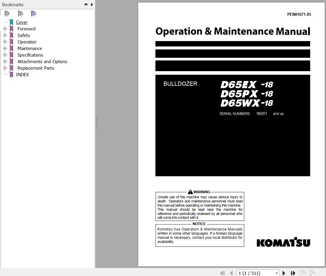 Komatsu D65EX-18 D65PX-18 D65WX-18 Operation & Maintenance Manual PEN01671-05