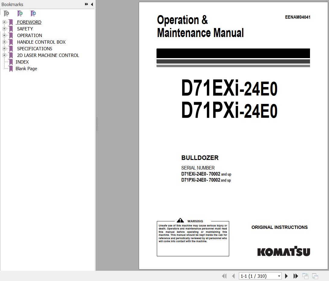 Komatsu D71EXI-24E0 D71PXI-24E0 Operation & Maintenance Manual EENAM04041