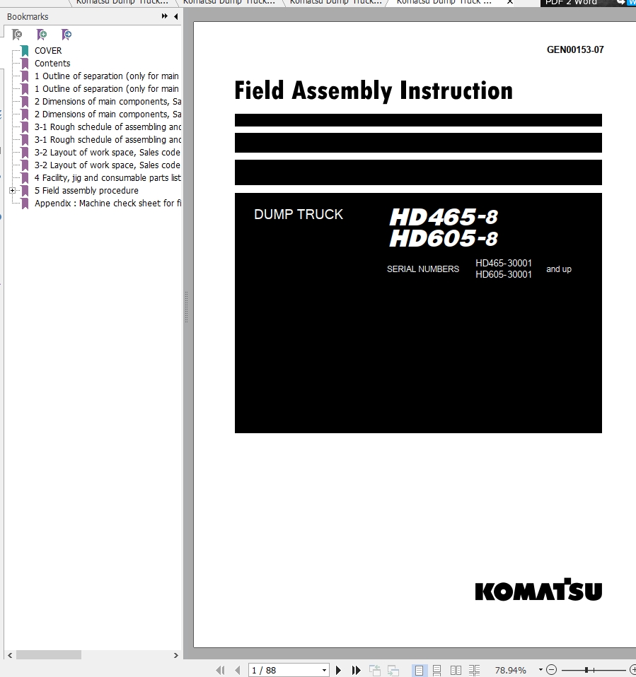 The Bookmarks of Komatsu HD465-8 HD605-8 Dump Truck Field Assembly Instruction: