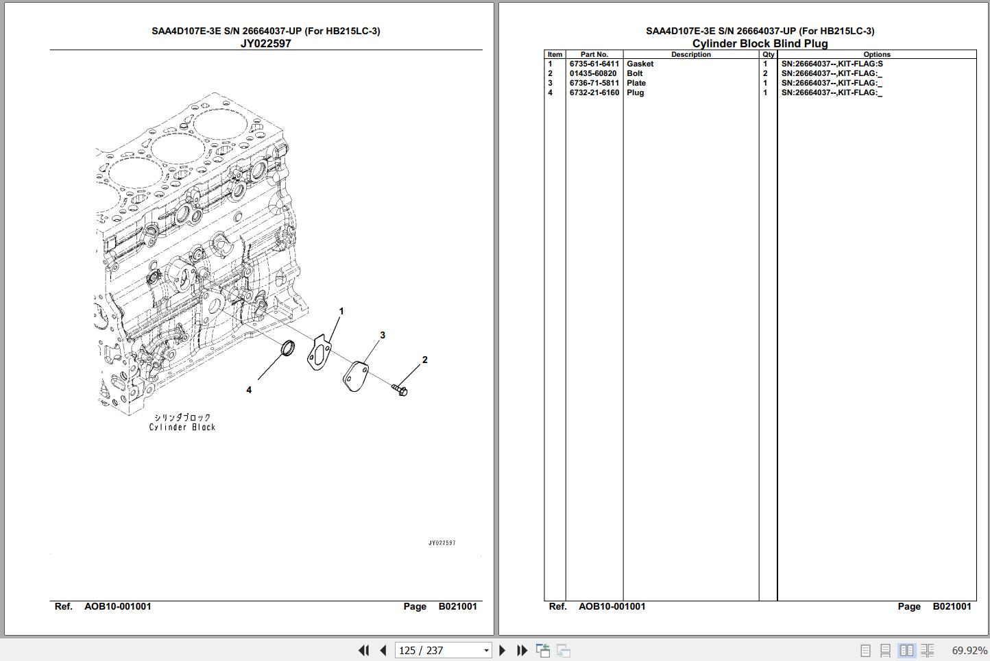 Komatsu Engine SAA4D107E-3E 26664037 Up For HB215LC-3 Spare Parts Catalog