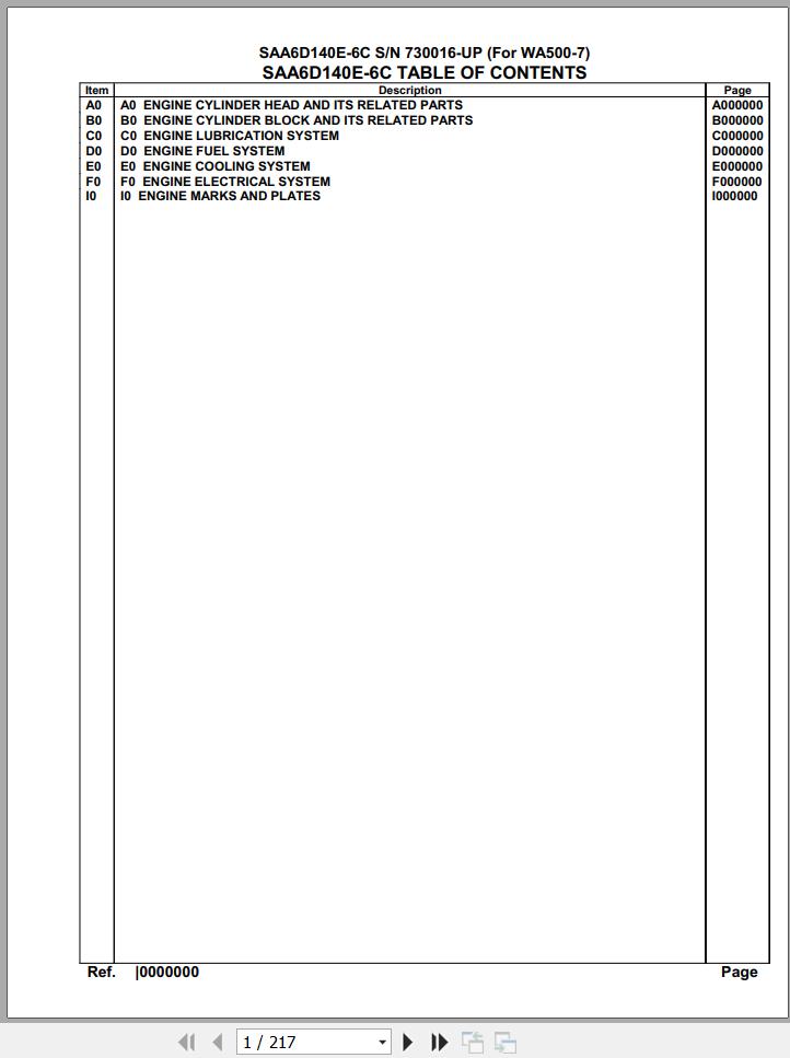 The Bookmarks of Komatsu Engine SAA6D140E-6C 730016 Up For WA500-7 Spare Parts Catalog: