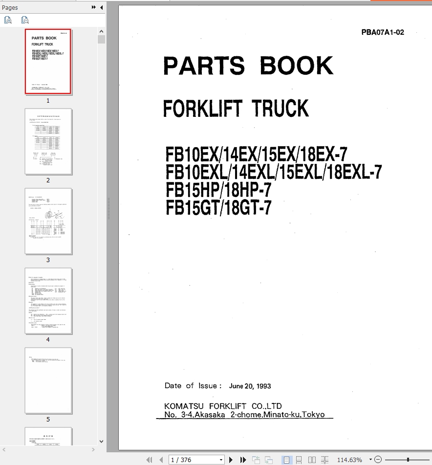 Komatsu FB10EX-7 FB18GT-7 Part Book PBA07A1-02