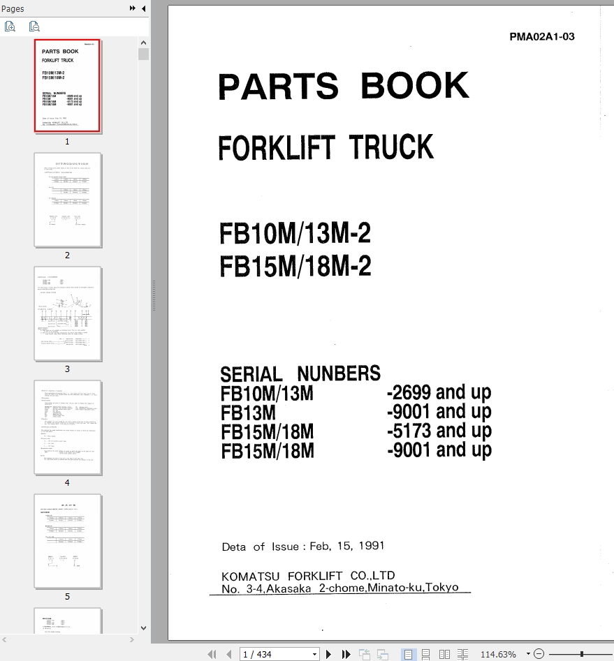Komatsu FB10M-2 FB13M-2 FB15M-2 FB18M-2 Part Book PMA02A1-03