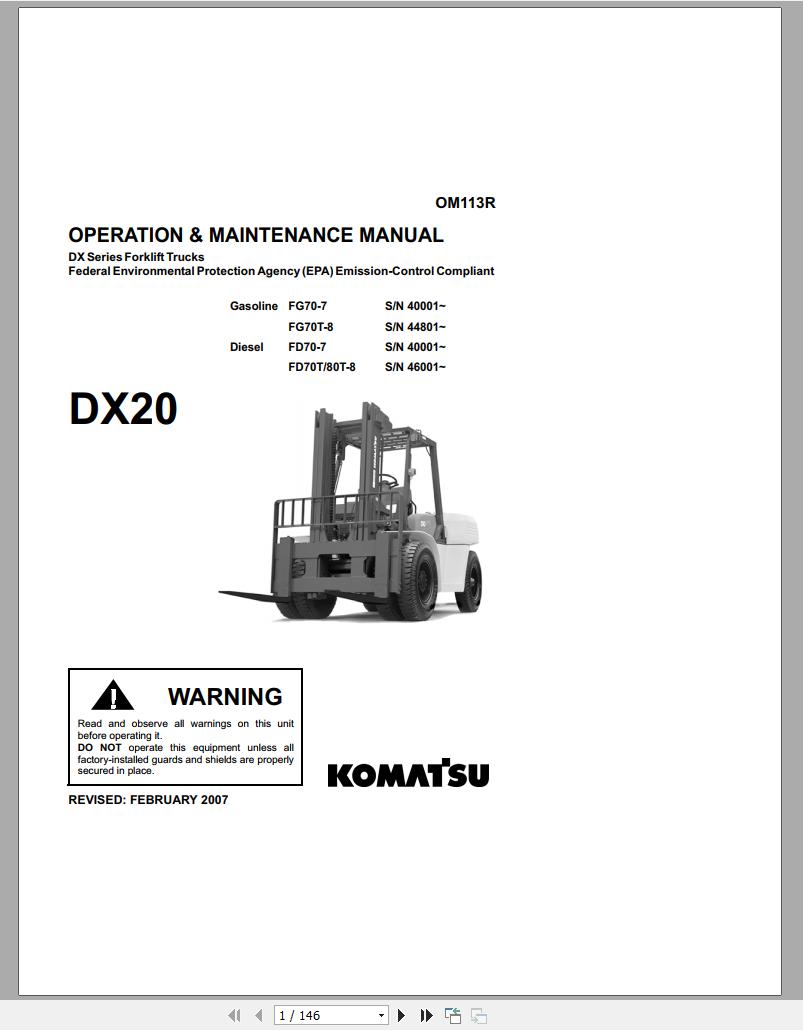 Komatsu FD70T-7 DX20 Series Operation & Maintenance Manual OM113R