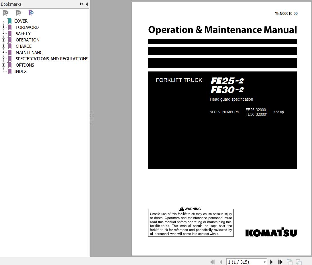 Komatsu FE25-2 FE30-2 Operation & Maintenance Manual YEN00010-00