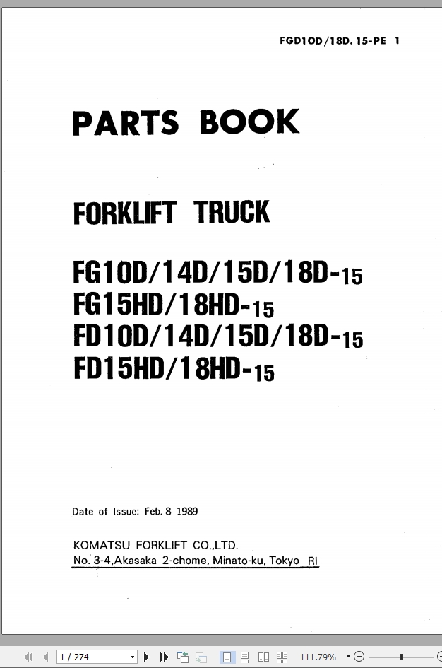 Komatsu FG10-15 FD18HD-15 Part Book FGD10D_18D-15-PE1