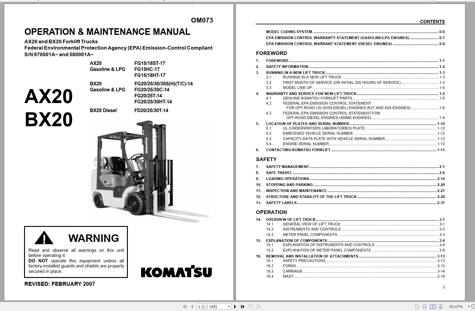 Komatsu FG15-17 FG18ST-17 FG15HC-17 FG15HT-17 FG18HT-17 Operation & Maintenance Manual OM073
