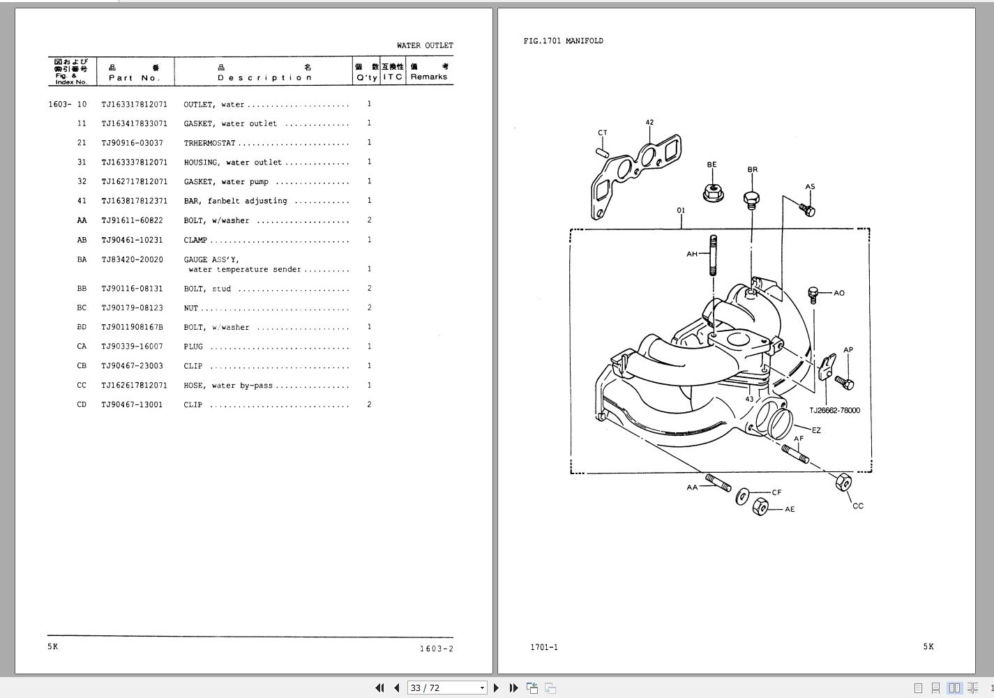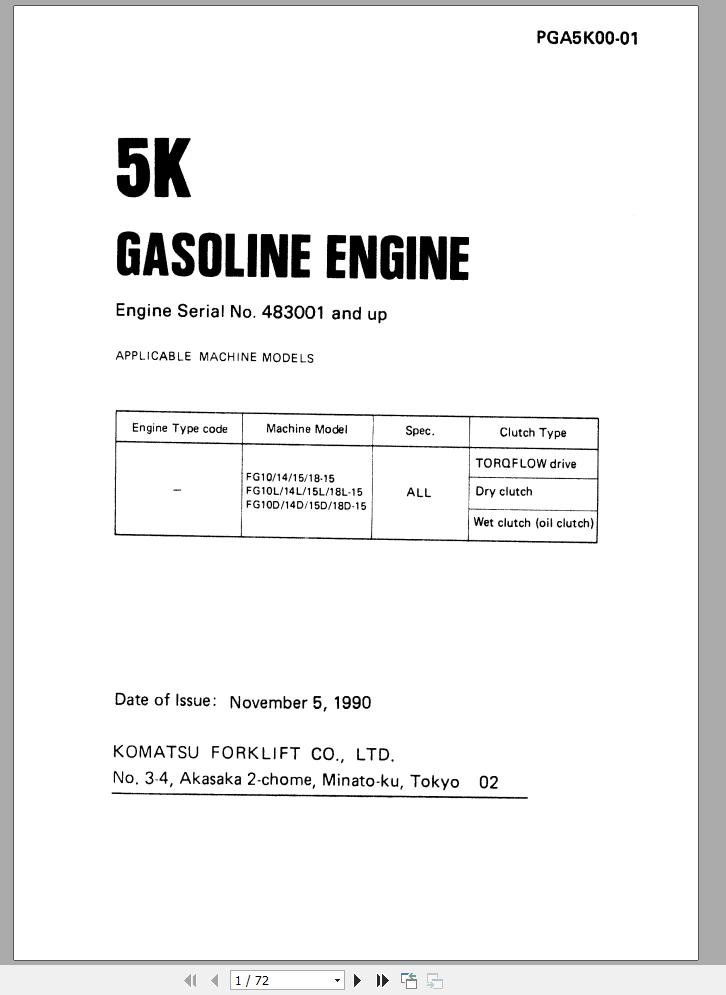 Komatsu FG18-15 Gasoline Engine 5K Parts Manual PGA5K00-01