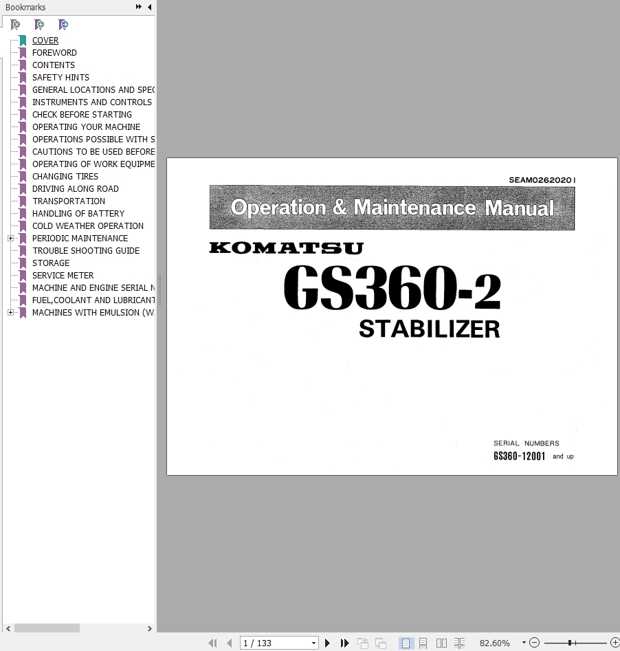 The Bookmarks of Komatsu GS360-2 Stabilizer Operation & Maintenance Manual: