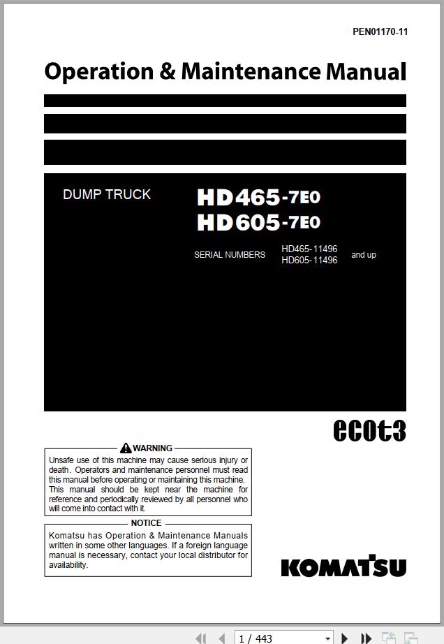 Komatsu HD465-7E0 HD605-7E0 Operation & Maintenance Manual PEN01170-11