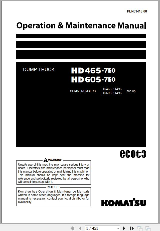 Komatsu HD465-7E0 HD605-7E0 Operation & Maintenance Manual PEN01418-08