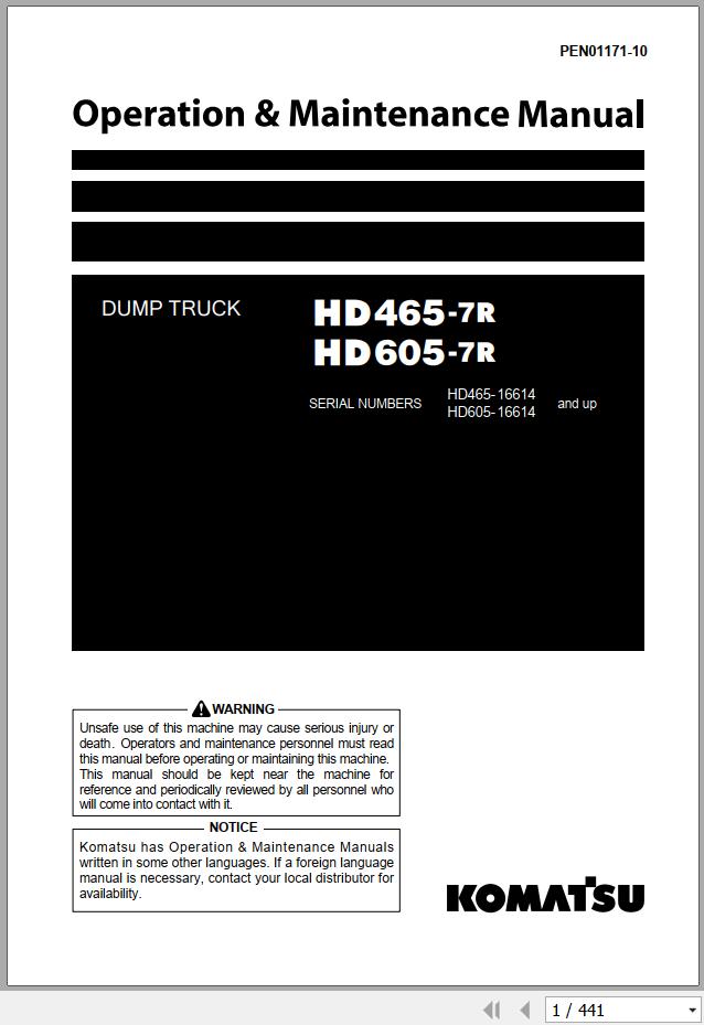 Komatsu HD465-7R HD605-7R Operation & Maintenance Manual PEN01171-10