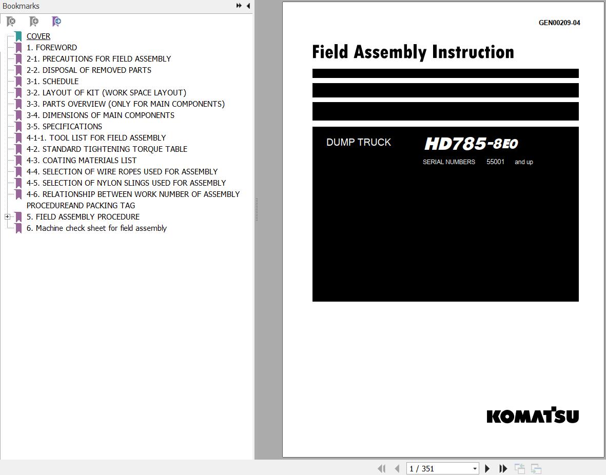 The Bookmarks of Komatsu HD785-8E0 Articulated Dump Truck Field Assembly Manual:
