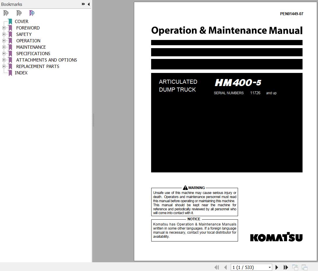 The Bookmarks of Komatsu HM400-5 Operation & Maintenance Manual: