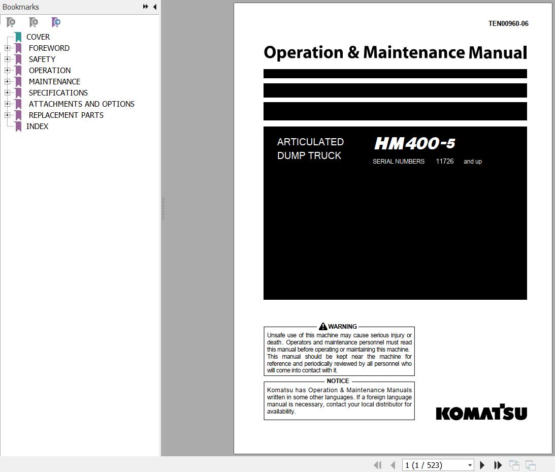 The Bookmarks of Komatsu HM400-5 Dump Truck Operation & Maintenance Manual: