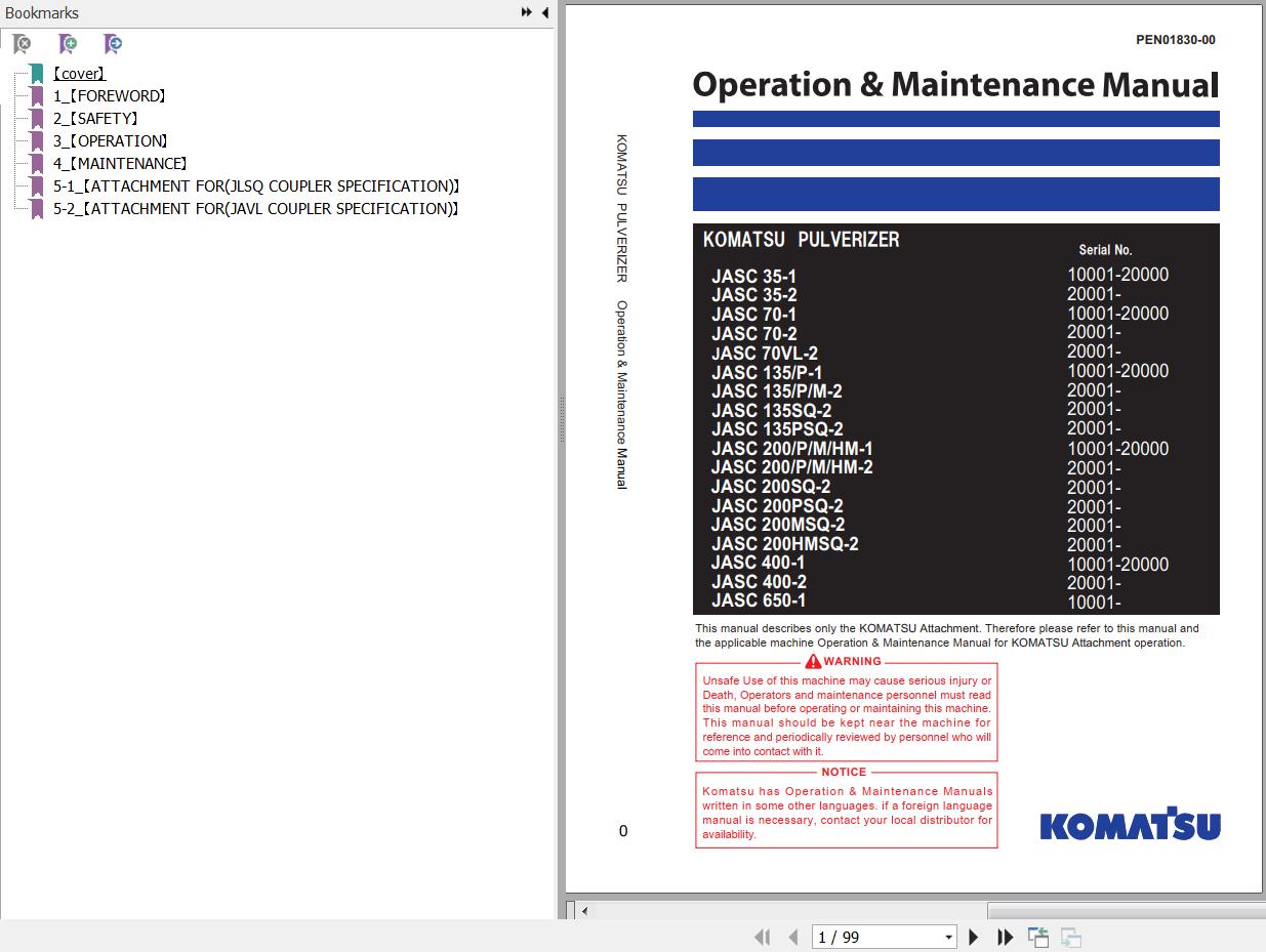The Bookmarks of Komatsu JASC400-2 Pulverizer Operation & Maintenance Manual: