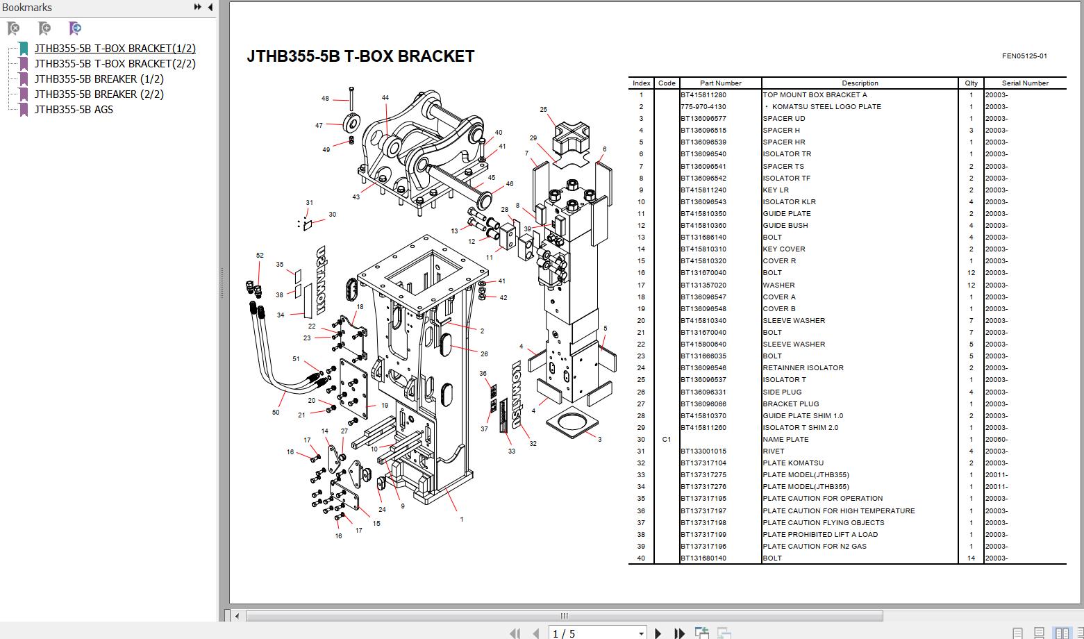 Komatsu JTHB355-5B T-Box Bracket Parts Book FEN05125-01