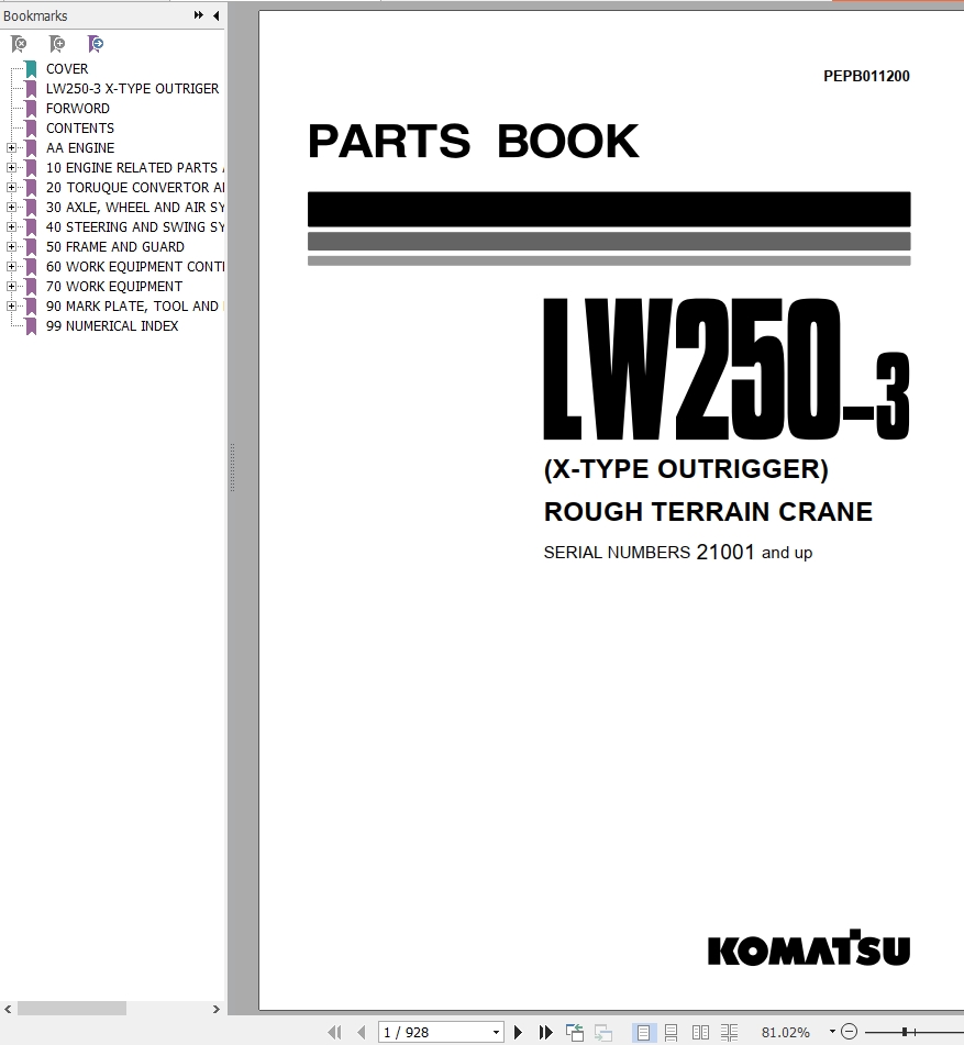The Bookmarks of Komatsu LW250-3 Rough Terrain Crane Part Book: