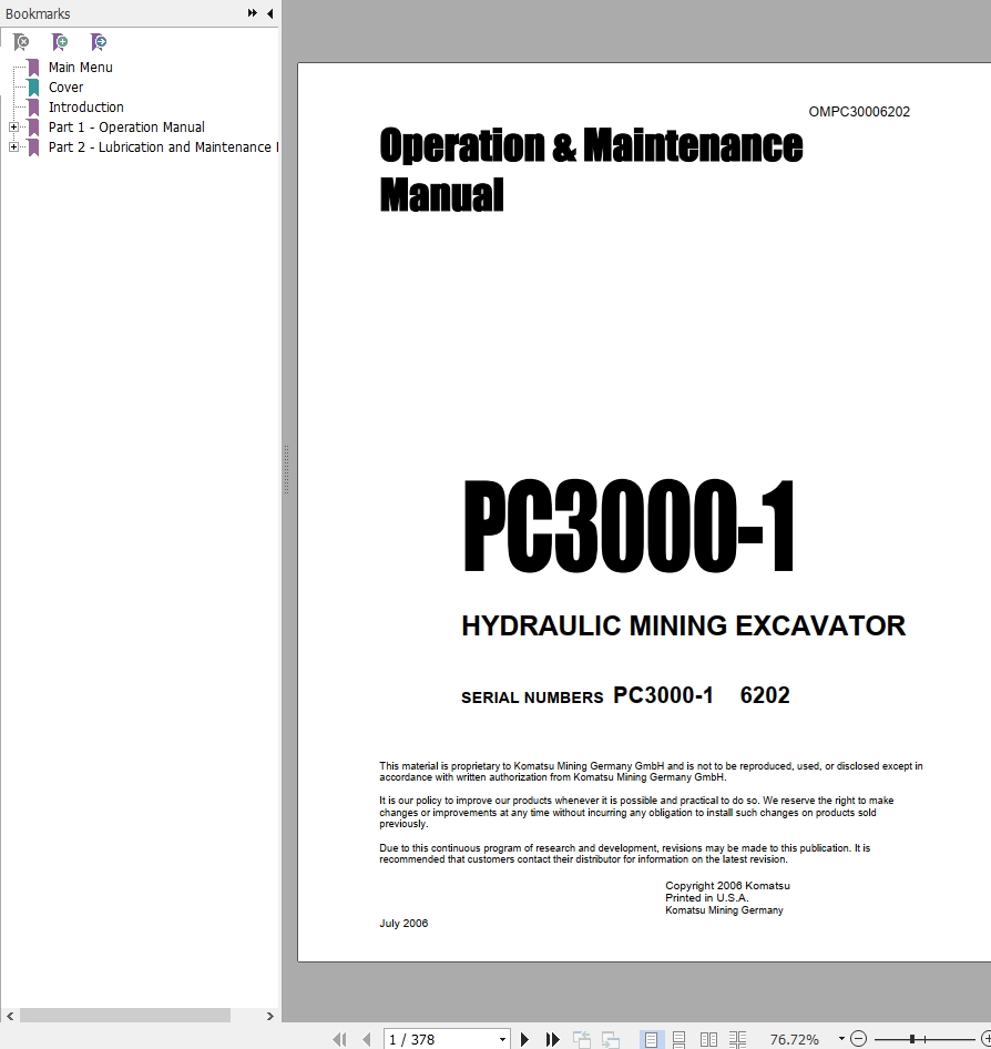 The Bookmarks of Komatsu PC3000-1 Hydraulic Mining Excavator Operation & Maintenance Manual: