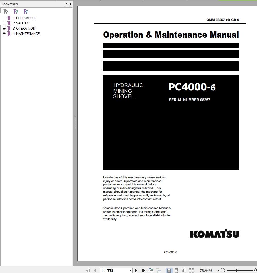 The Bookmarks of Komatsu PC4000-6 Hydraulic Mining Shovel Operation & Maintenance Manual: