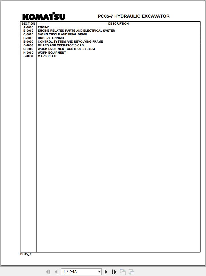 The Bookmarks of Komatsu PC05-7 F20001 Up Spare Parts Catalog: