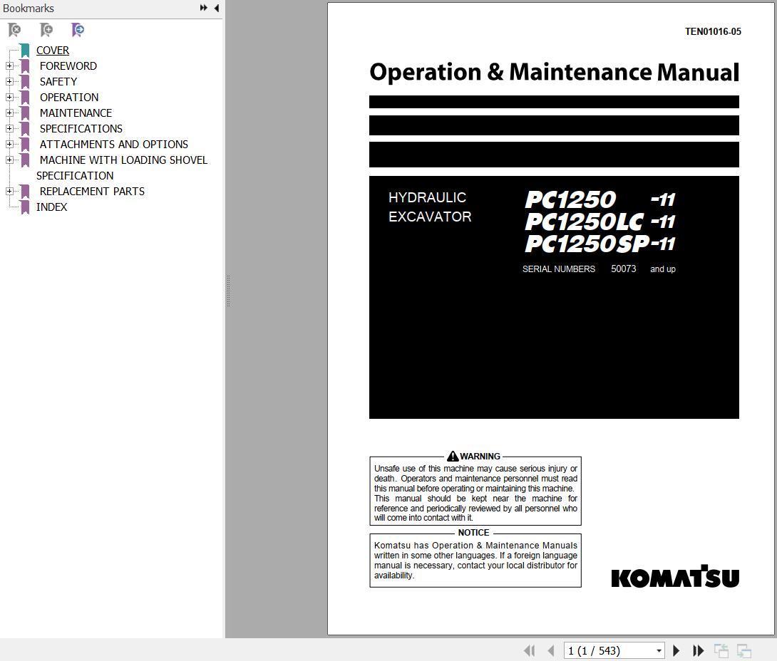 Komatsu PC1250-11 PC1250LC-11 PC1250SP-11 Operation & Maintenance Manual TEN01016-05